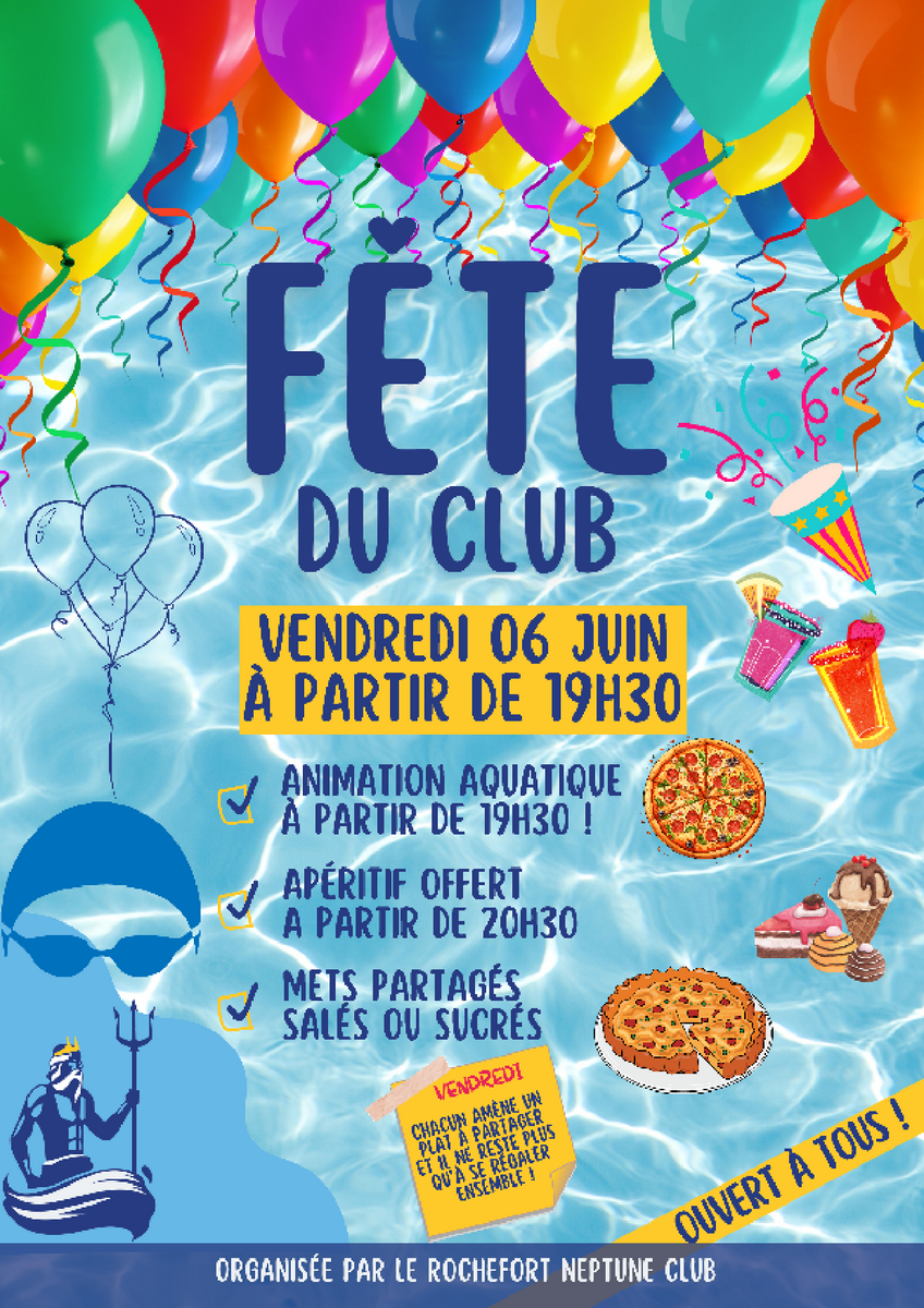 Le Rochefort Neptune Club est heureux de convier lâensemble de ses adhĂ©rents, nageurs, familles et amis Ă sa fĂȘte annuelle qui se tiendra le vendredi 6 juin 2025 Ă partir de 19h30. Ce moment convivial se dĂ©roulera dans la bonne humeur autour dâun apĂ©ritif dĂźnatoire. N'hĂ©sitez pas a rĂ©server votre participation.
